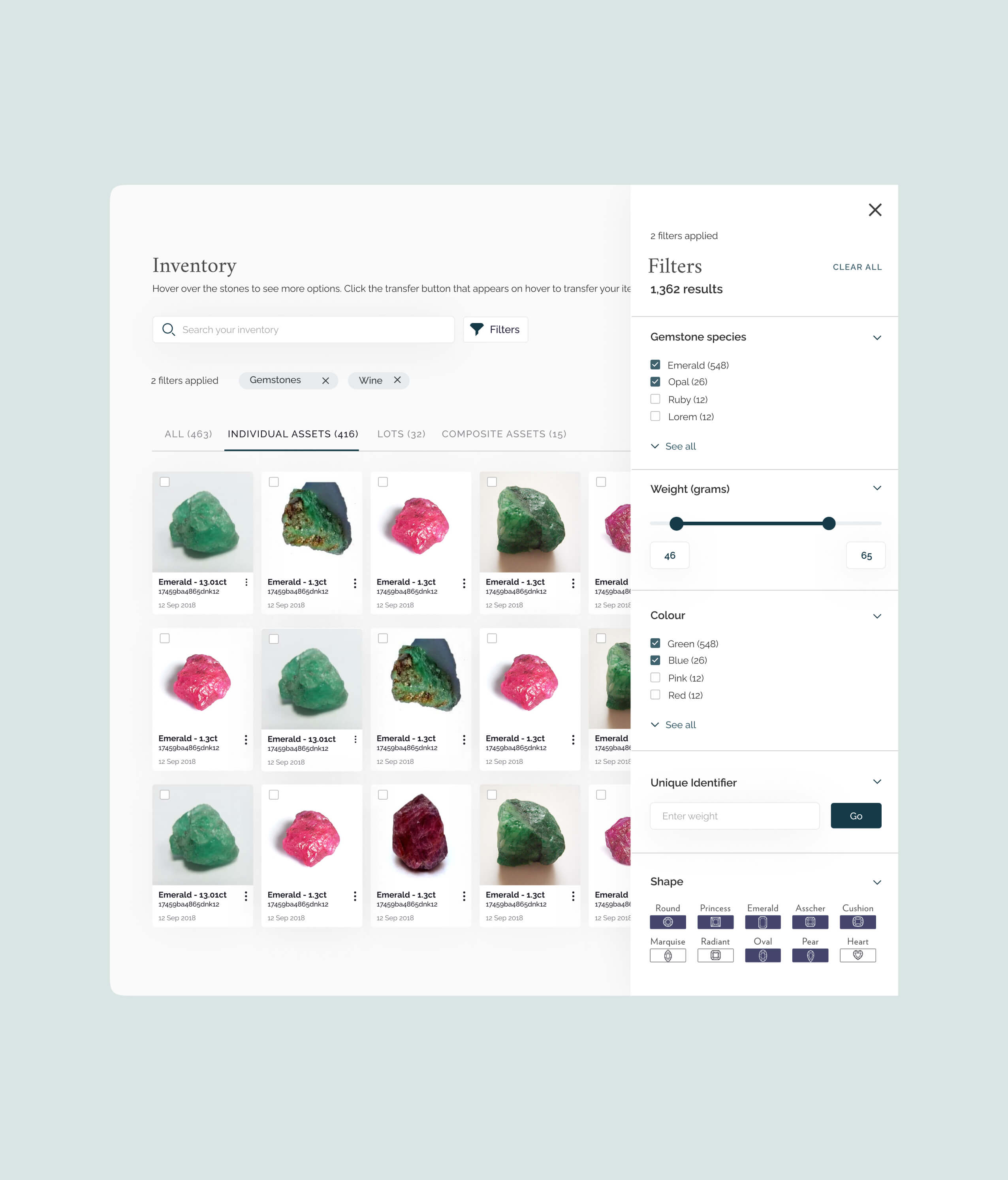 The advanced filtering options for stone, parcel, and jewellery inventories